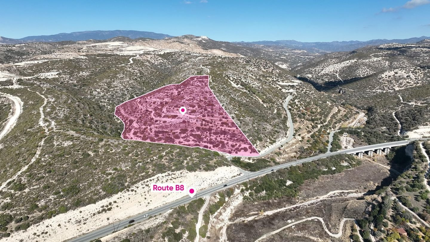 An excellent opportunity to acquire a 100% share of a substantial protection-zone field located in the scenic community of Alassa, Limassol district. Positioned on elevated ground, the property enjoys open views towards the Kouris Dam, offering a rare sense of space, privacy and natural beauty. The field extends to a total area of 66,230 sq.m. and is situated approximately 700m northeast of Alassa village centre, just 40m north of the main Limassol–Saitas Road, and around 1.8km northeast of Kouris Dam. Its strategic location provides easy access while maintaining a tranquil rural setting. The asset benefits from direct frontage of approximately 45m along a public registered road on its southeastern boundary, enhancing accessibility and future potential. Within the field there is an old obsolete structure with no economic value. This property is ideal for buyers seeking a large land holding in a growing rural area of Limassol, with strong long-term potential, excellent access, and commanding natural views. The property falls within Zone Ζ3-ΠΤ, with a building coefficient of 1%, coverage of 1%, and permission for 1 floor (5m) of construction. There is a separate title deed for this property.